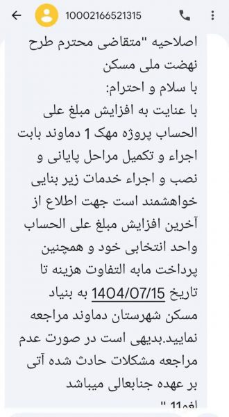 به گزارش پایگاه خبری تارود، جمعی از متقاضیان طرح مسکن ملی در دماوند، پس از چندین مرحله واریز مبالغ بالا و تسویهحساب با بنیاد مسکن، این نهاد مجدداً درخواست پرداخت بیش از ۱۰۰ میلیون تومان را مطرح کرده است.