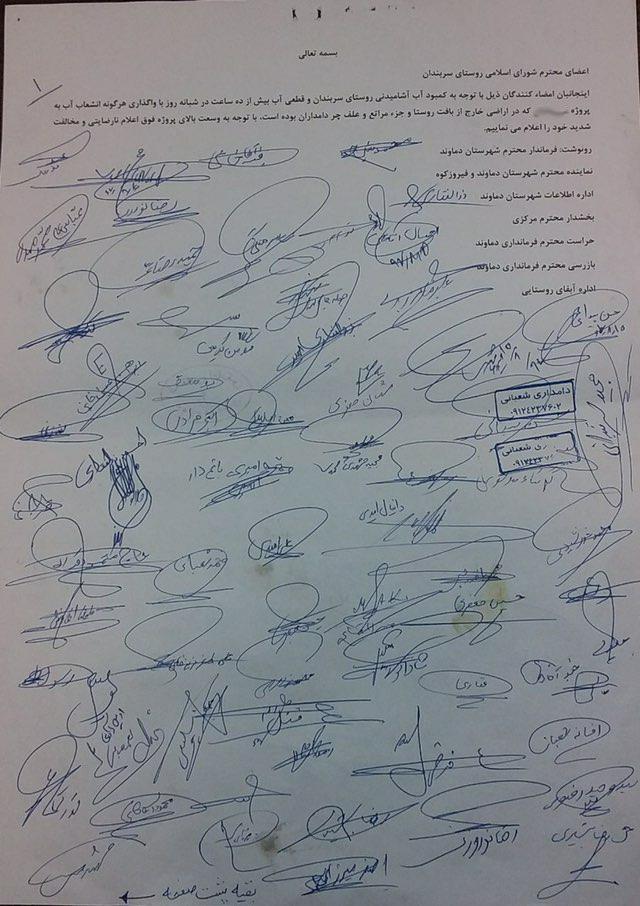 طومار اعتراض مردمی اهالی روستای سربندان دماوند نسبت به واگذاری انشعاب آب شرب به پروژهای که میگویند، خارج از بافت روستا و مراتع دامداران واقع شده است.