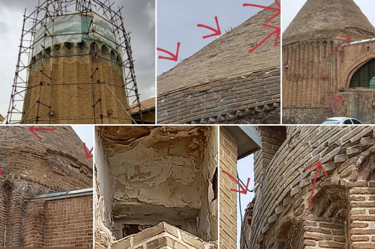 این موضوع مطمئنا تا الان صدمات زیادی به مصالح بنا زده، به جهت وجود پلاستیک آسیبهای گنبد الان دیده نمیشود اما پایه گنبد آجرکاریها و کاشیکاریها در حال ریزش هستند و پایه گنبد ترک خورده است.