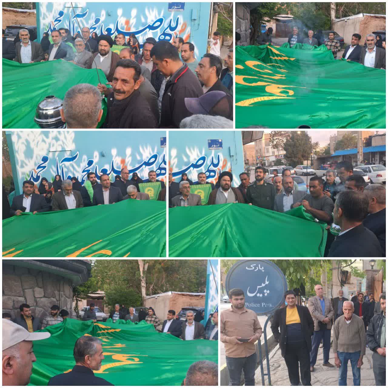 اهتزاز پرچم تکه دوزی شده مزین به نام مبارک علی ابن موسی الرضا(ع) در شهر آبسرد