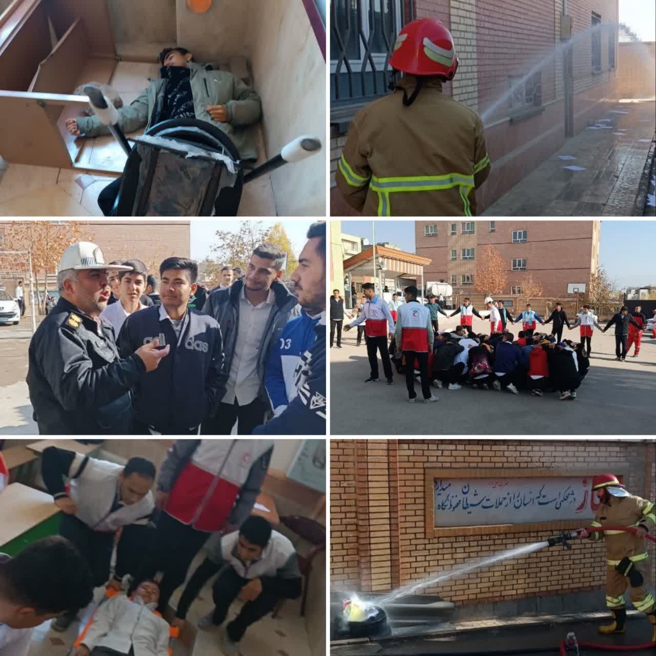 سناریوهای تمرینی شامل آتشسوزی، ریزش و آوار بخشی از سازه و ایجاد موانع در مسیر خروج دانشآموزان بود که با مشارکت کارکنان مدرسه و نیروهای امدادی، راهکارهای عملی مقابله با بحران بهطور کامل اجرا شد تا سرعت واکنش، کاهش اضطراب و دقت در اجرای اقدامات ایمنی تقویت شود.