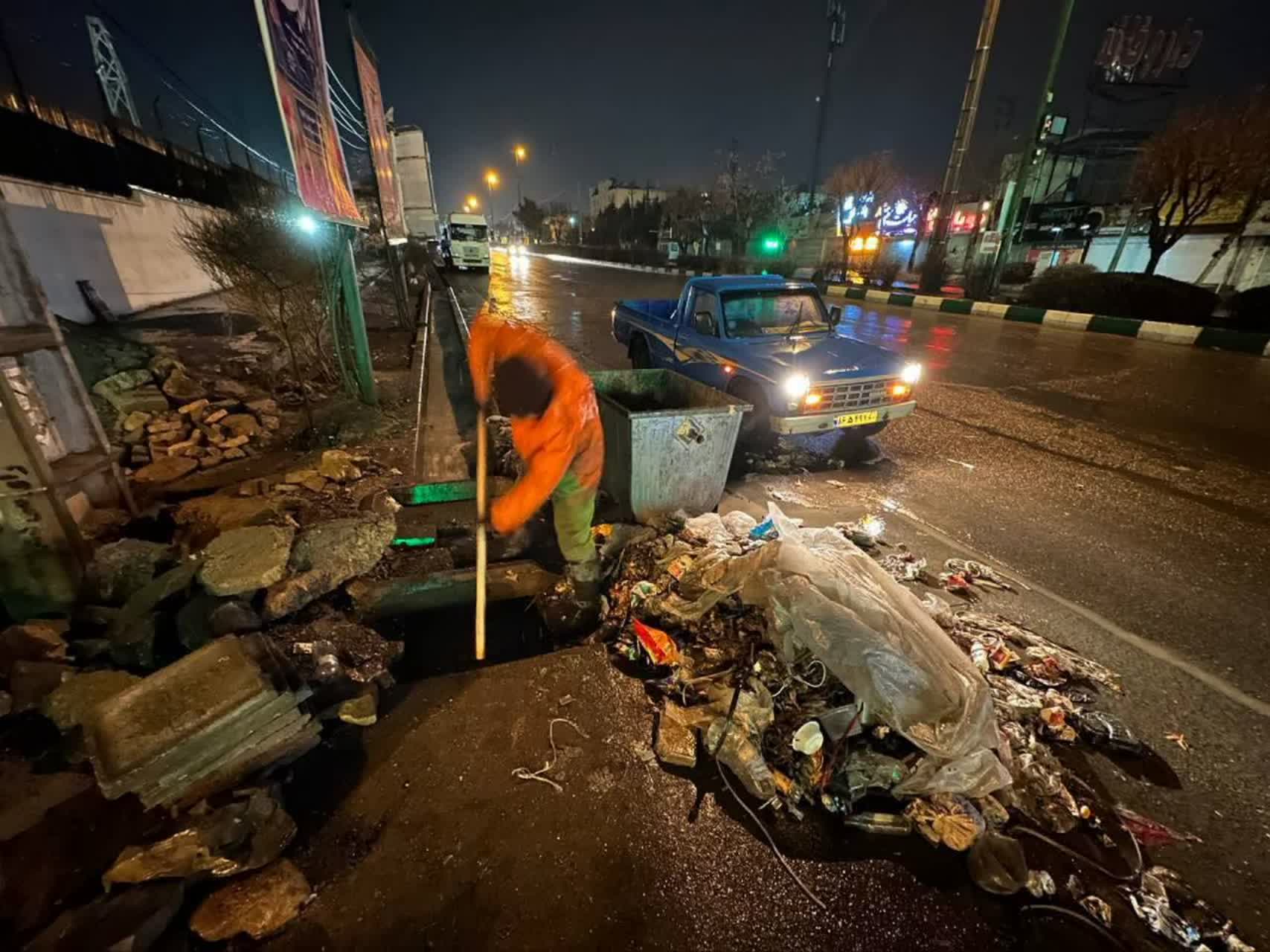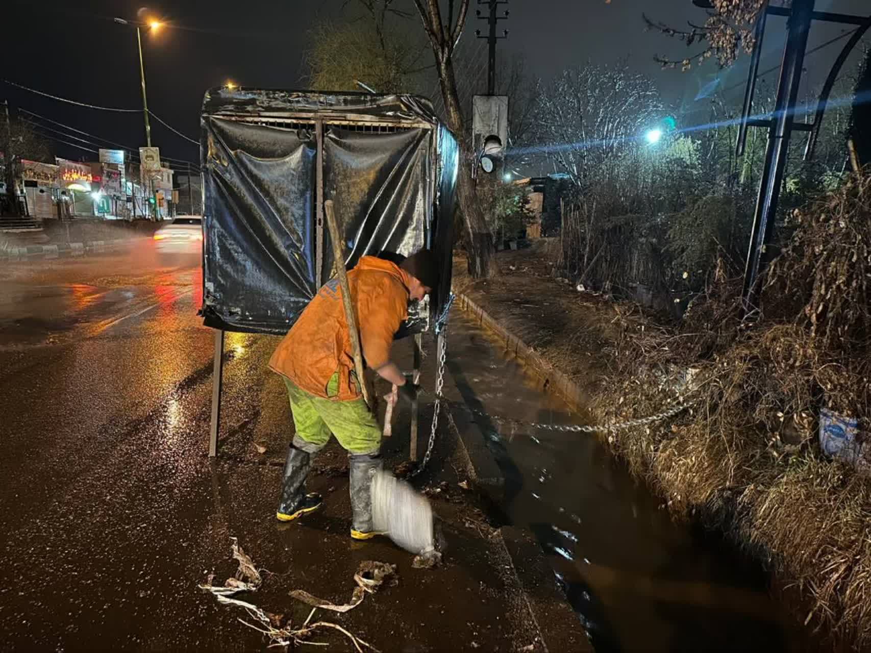 تلاش شبانه عوامل خدمات شهری شهرداری دماوند برای رفع آبگرفتگی معابر
