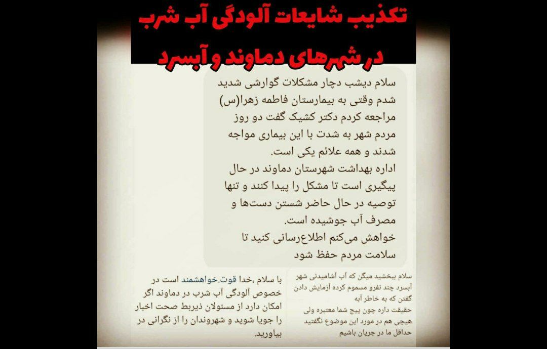 با پیگیریهای انجام شده جهت برررسی صحت این موضوع از رئیس شبکه بهداشت و درمان دماوند گفت: پیرو شایعات پیش آمده و مراجعات در شهرهای دماوند و آبسرد با نمونهگیری انجام شده از آب شرب توسط کارشناسان انجام شد.