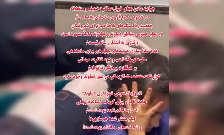 جوابیه دادن بجای قبول کردن عملکرد ضعیف و منفعلانه در خصوص جمعآوری سگهای بلاصاحب/ جمعیت زیاد سگهای بلاصاحب برای شهروندان در معابر عمومی مناطق دماوند و گیلاوند کاملاً مشهود است/ عدم شفافسازی هزینههای میلیاردی برای ساماندهی سگهای بلاصاحب و نبود نظارت میدانی بر عملکرد پیمانکار مربوطه/ گزارشات متعدد سگگزیدگی در شهر دماوند وجود دارد
