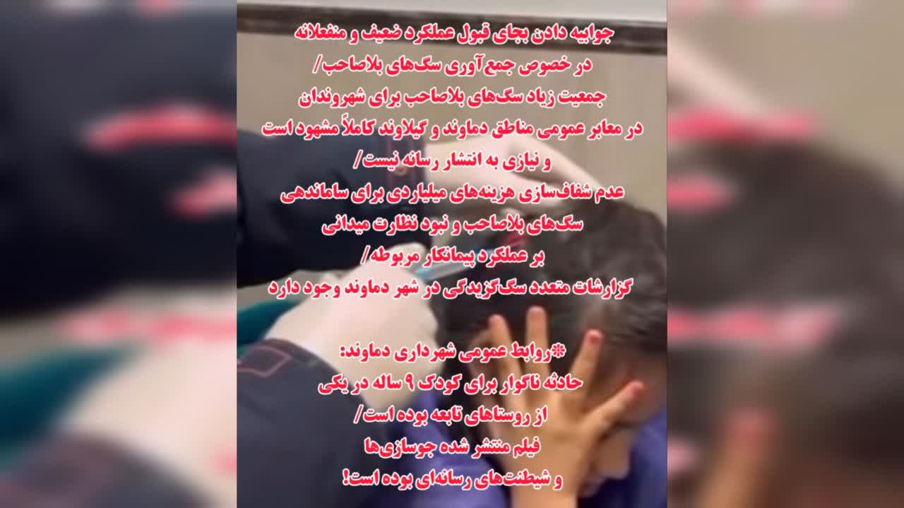 متأسفانه این روزها جمعیت زیاد سگهای بلاصاحب برای شهروندان در معابر عمومی مناطق دماوند و گیلاوند کاملاً مشهود است و نیازی به انتشار رسانه نیست. از طرفی هم عدم شفافسازی هزینههای میلیاردی برای ساماندهی سگهای بلاصاحب و نبود نظارت میدانی بر عملکرد پیمانکار مربوطه مبهم است.