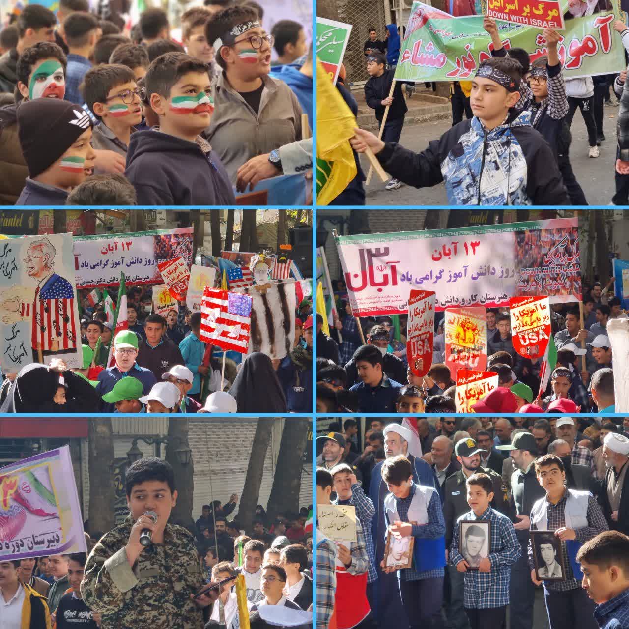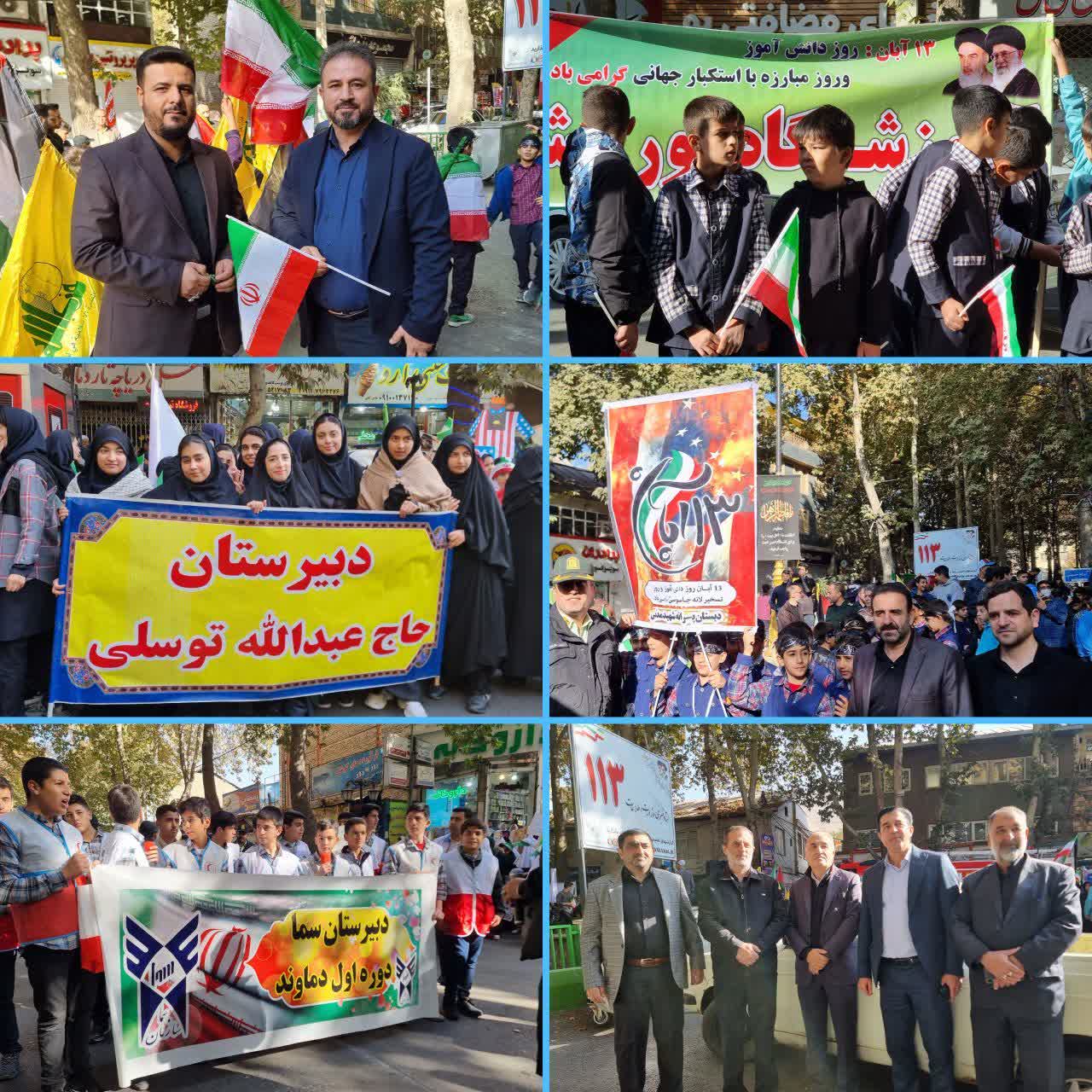 راهپیمایی عظیم و پرشور ۱۳ آبان، روز ملی مبارزه با استکبار جهانی و روز دانشآموز، صبح امروز با حضور چشمگیر دانشآموزان، دانشجویان، مسئولان و اقشار مختلف مردم شهرستان دماوند برگزار شد و جلوهای باشکوه از وحدت و همبستگی مردمی خلق کرد.