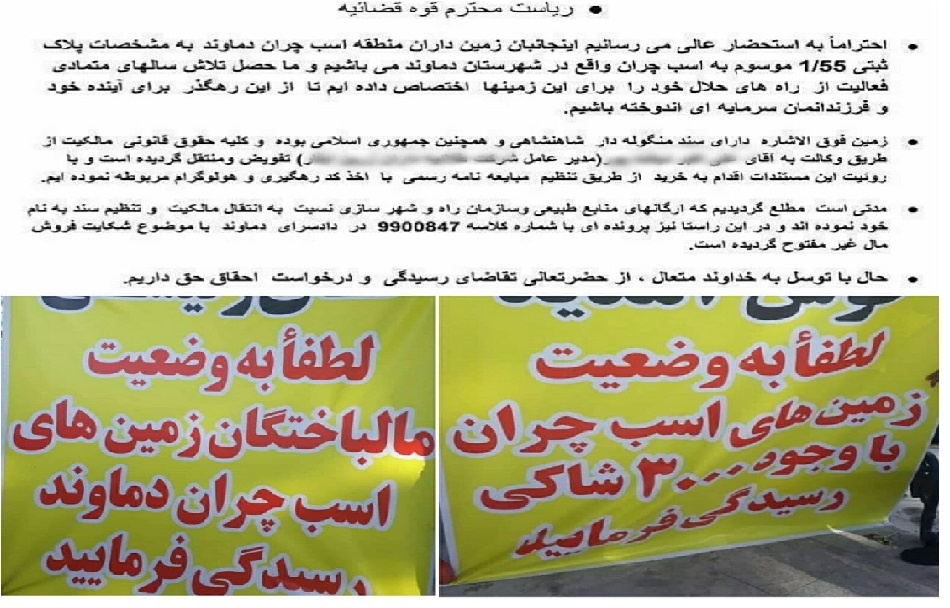 درخواست مالباختگان اراضی اسب چران دماوند از مسئولان قضایی؛ به وضعیت مالباختگان اراضی اسب چران با ۳۰۰۰ شاکی رسیدگی شود.