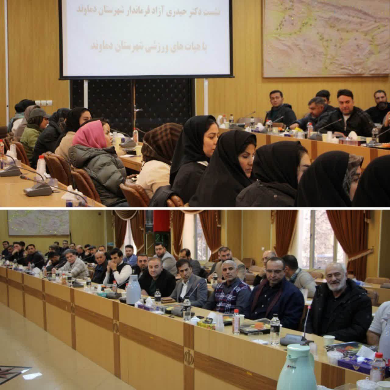 نشست صمیمی رؤسای هیئتهای ورزشی شهرستان دماوند با دکتر اسماعیل حیدریآزاد، فرماندار شهرستان، با حضور آرمودیان معاون امنیتی، سیاسی و اجتماعی فرماندار و زارعنیا سرپرست اداره ورزش و جوانان شهرستان، در سالن جلسات شهید رجایی دماوند برگزار شد.