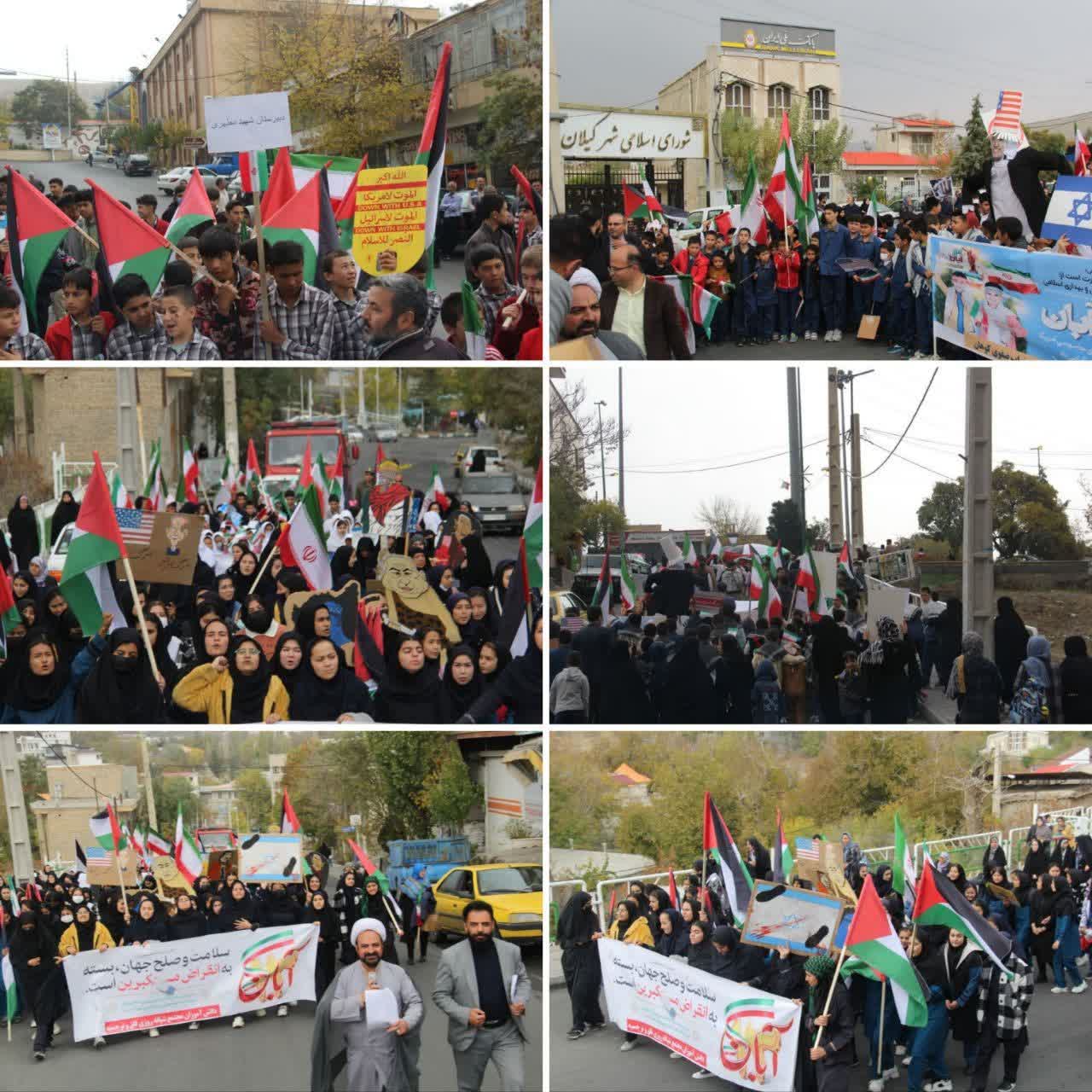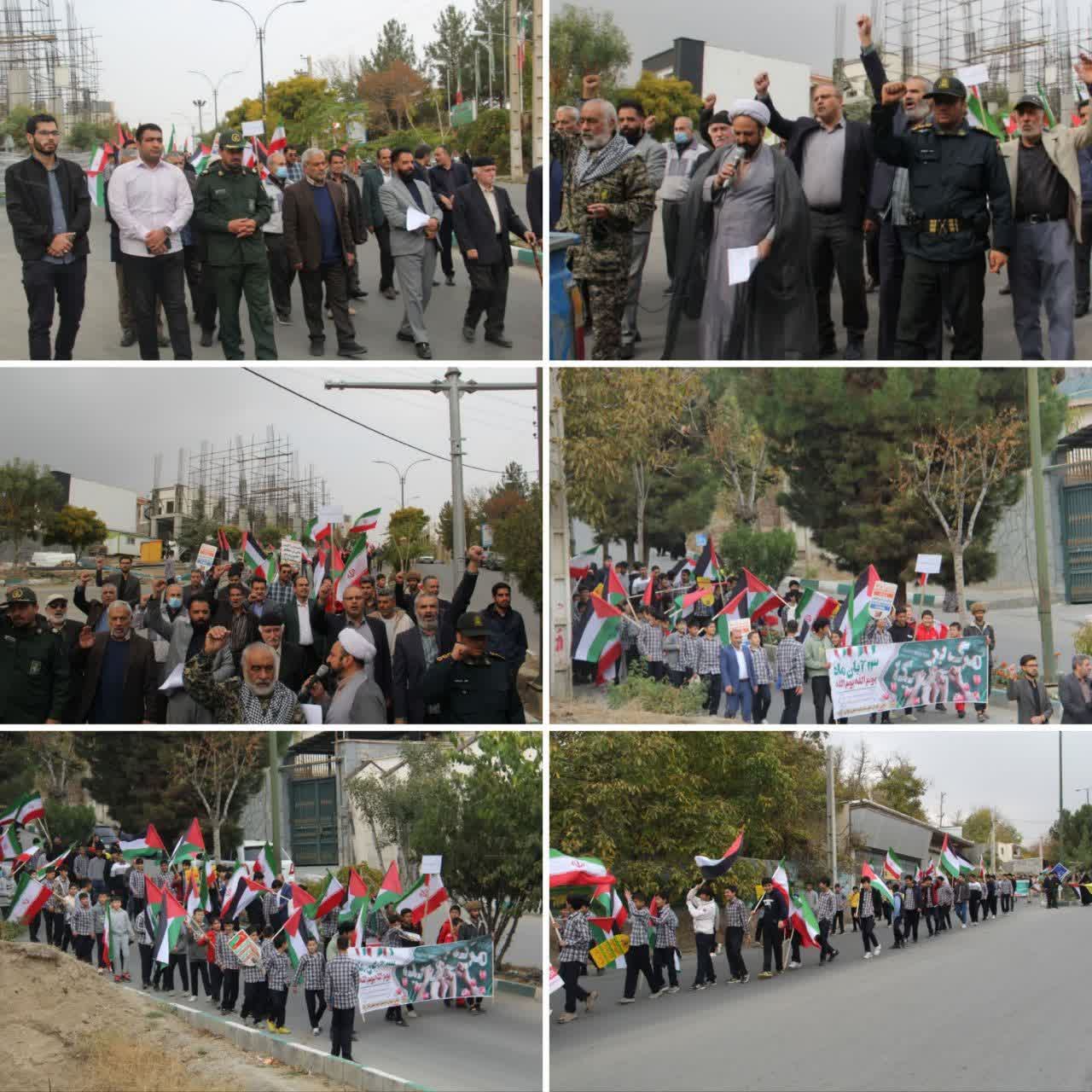 آحاد مردم، دانشآموزان و مسئولان شهری با شعارهای مرگ بر آمریکا و مرگ بر اسرائیل انزجار خود را از جنایات آمریکا و رژیم صهیونسیتی علیه ملتهای مسلمان به ویژه مردم مظلوم فلسطین و غزه ابراز داشتند.