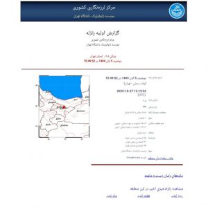 به گزارش پایگاه خبری تارود، بر اساس گزارش مرکز لرزهنگاری کشوری مؤسسه ژئوفیزیک دانشگاه تهران، عصر امروز دوشنبه ۵ آبان ۱۴۰۴، زمینلرزهای با بزرگی ۲.۸ ریشتر، مناطق دماوند و پردیس در شرق استان تهران را لرزاند.
