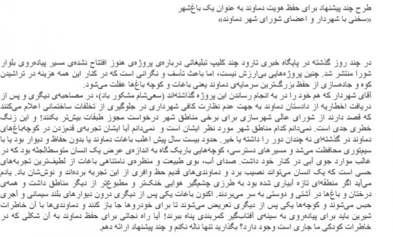 طرح چند پیشنهاد برای حفظ هویت دماوند به عنوان یک باغشهر؛ «سخنی با شهردار و اعضای شورای شهر دماوند»