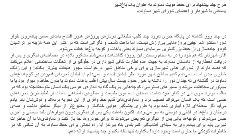طرح چند پیشنهاد برای حفظ هویت دماوند به عنوان یک باغشهر؛ «سخنی با شهردار و اعضای شورای شهر دماوند»