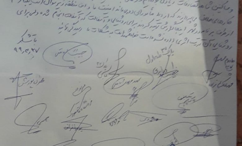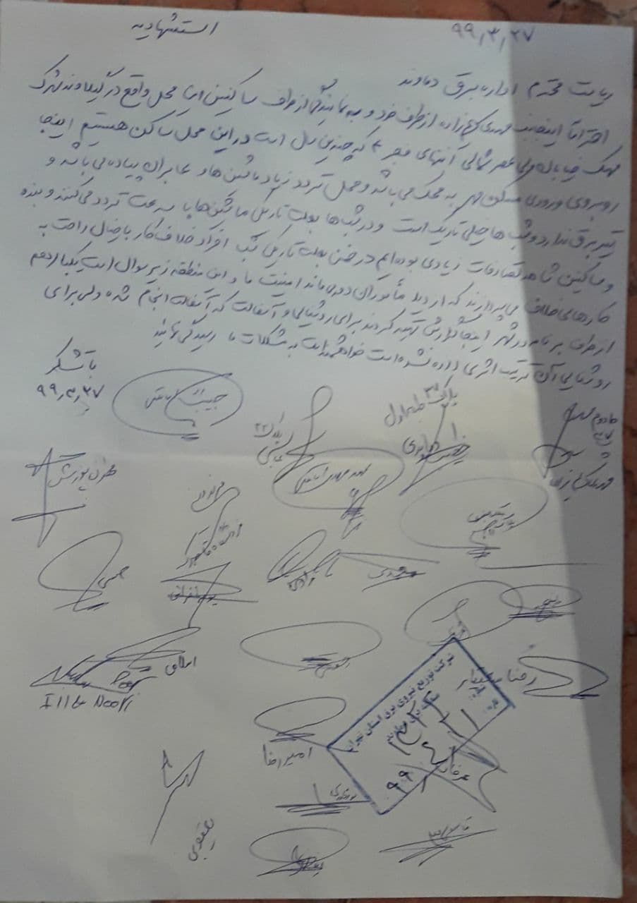 طومار اعتراضی اهالی خیابان ولیعصر شمالی شهرک مهک منطقه گیلاوند از خاموشی معابر