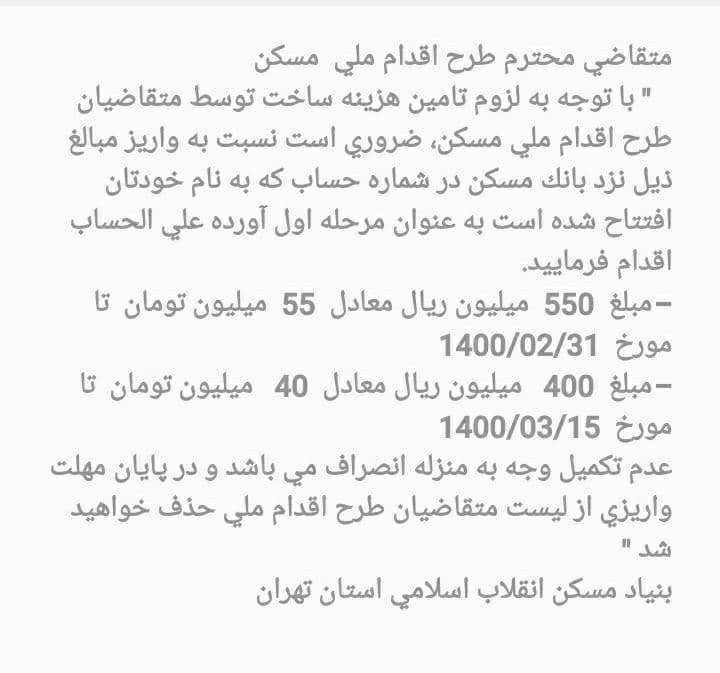 امروز از طرف بنیاد مسکن استان تهران پیامک آمده که تا یک ماه آینده حدود ۱۰۰ میلیون واریزی داشته باشیم.