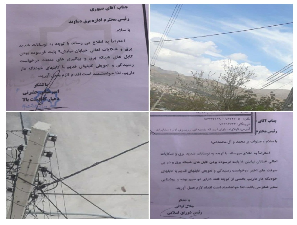شهروندی از مشکلات فرسوده بودن کابل برق در خیابانهای نیایش ۹ و ۱۱ روستای کالدشتبالا دماوند با توجه به نوسانات شدید برق گلایه کرد.